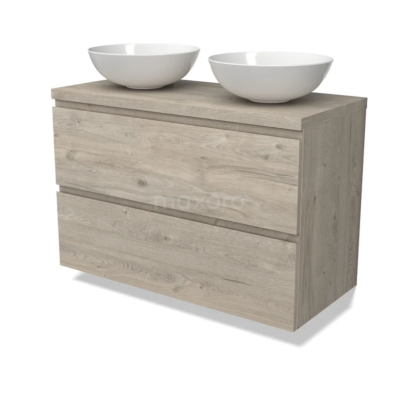 Modulo Plato Badmöbel mit Aufsatzwaschbecken | 100 cm Hellgraue Eiche Grifflos front Hellgraue Eiche blatt 2 übereinanderliegende Schubladen