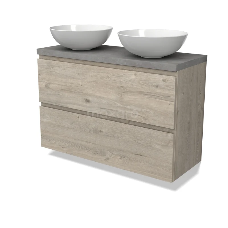 Modulo Plato Badmöbel mit Aufsatzwaschbecken | 100 cm Hellgraue Eiche Grifflos front Hellgrauer Beton blatt 2 übereinanderliegende Schubladen