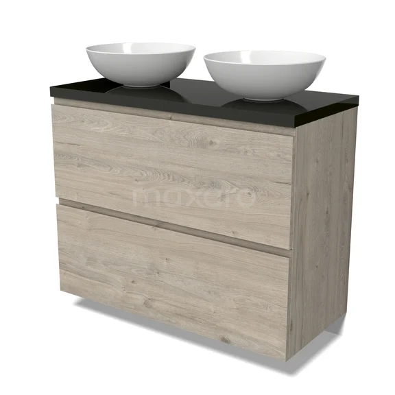 Modulo Plato Badmöbel mit Aufsatzwaschbecken | 100 cm Hellgraue Eiche Grifflos front Hochglanz Schwarz blatt 2 hohe Schubladen übereinanderliegend