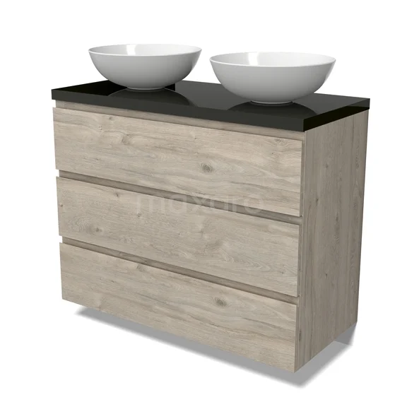 Modulo Plato Badmöbel mit Aufsatzwaschbecken | 100 cm Hellgraue Eiche Grifflos front Hochglanz Schwarz blatt 3 Schubladen