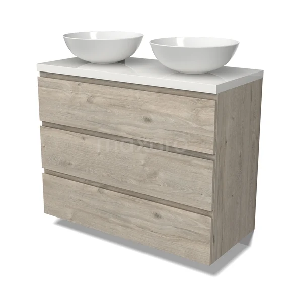 Modulo Plato Badmöbel mit Aufsatzwaschbecken | 100 cm Hellgraue Eiche Grifflos front Hochglanz Weiß blatt 3 Schubladen