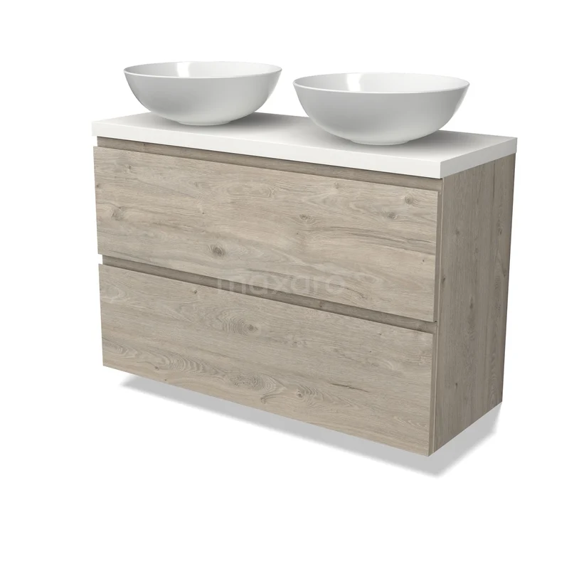 Modulo Plato Badmöbel mit Aufsatzwaschbecken | 100 cm Hellgraue Eiche Grifflos front Matt Weiß blatt 2 übereinanderliegende Schubladen