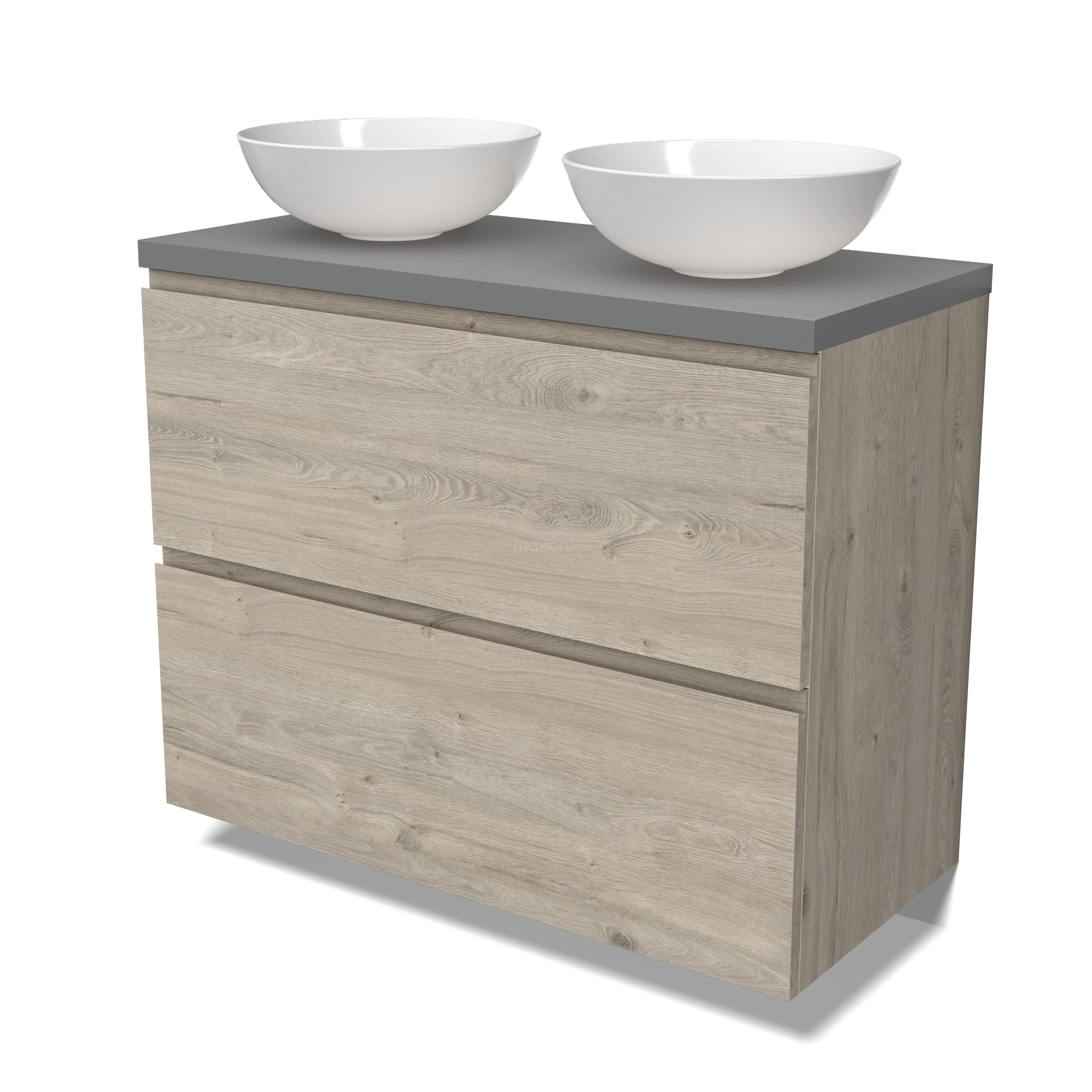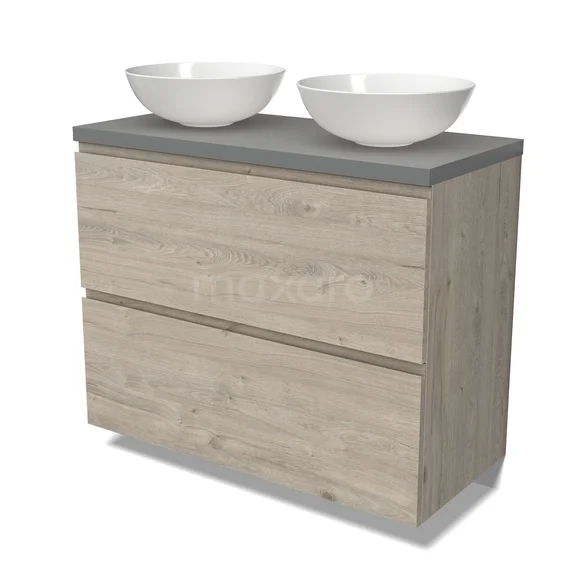 Modulo Plato Badmöbel mit Aufsatzwaschbecken | 100 cm Hellgraue Eiche Grifflos front Mittelgrau blatt 2 hohe Schubladen übereinanderliegend