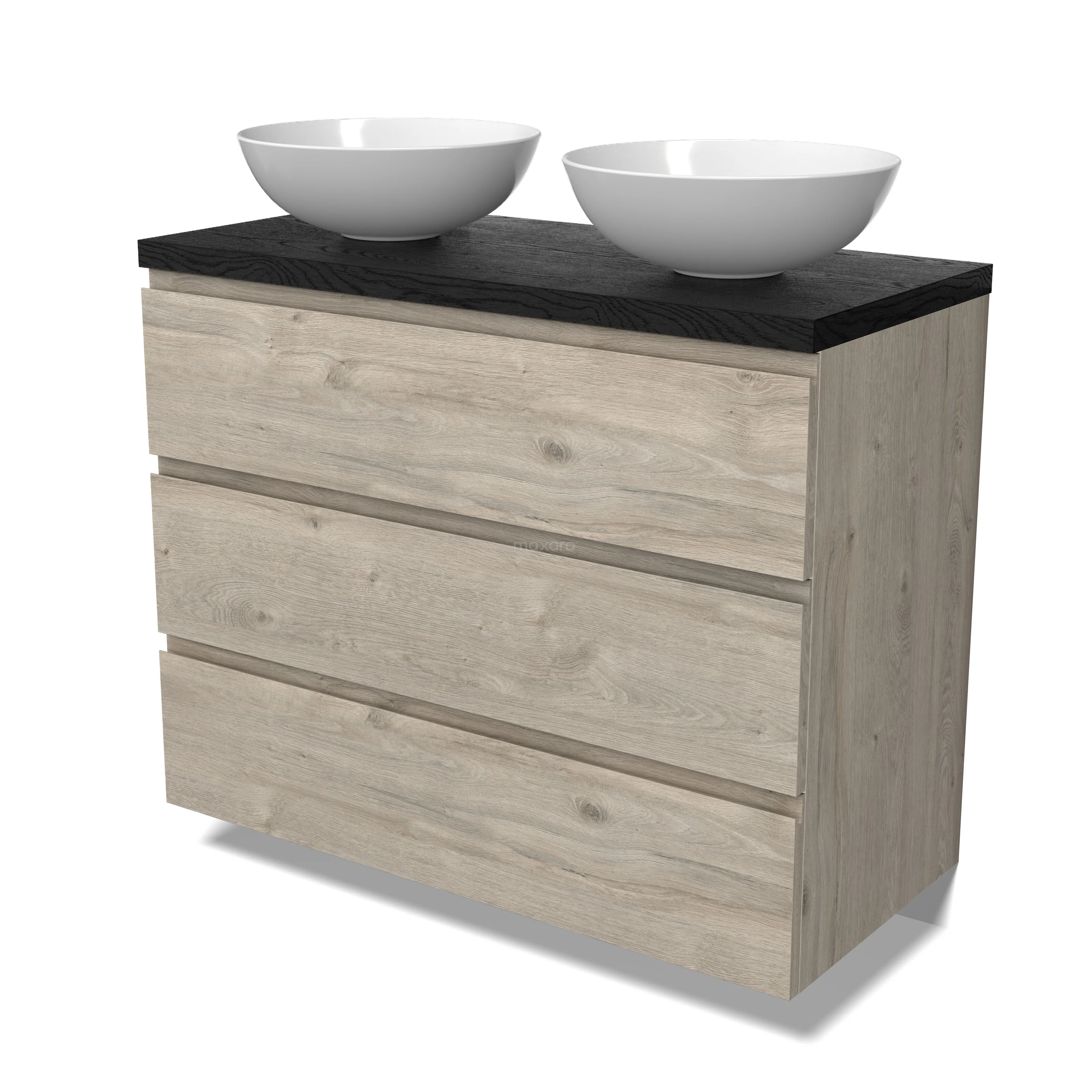 Modulo Plato Badmöbel mit Aufsatzwaschbecken | 100 cm Hellgraue Eiche Grifflos front Schwarze Eiche blatt 3 Schubladen
