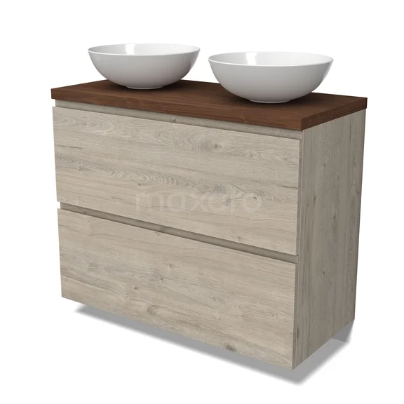 Modulo Plato Badmöbel mit Aufsatzwaschbecken | 100 cm Hellgraue Eiche Grifflos front Walnuss blatt 2 hohe Schubladen übereinanderliegend