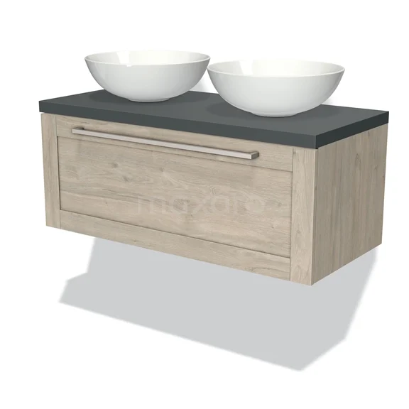 Modulo Plato Badmöbel mit Aufsatzwaschbecken | 100 cm Hellgraue Eiche Rahmen front Dunkelgrau blatt 1 Schublade