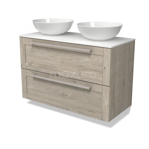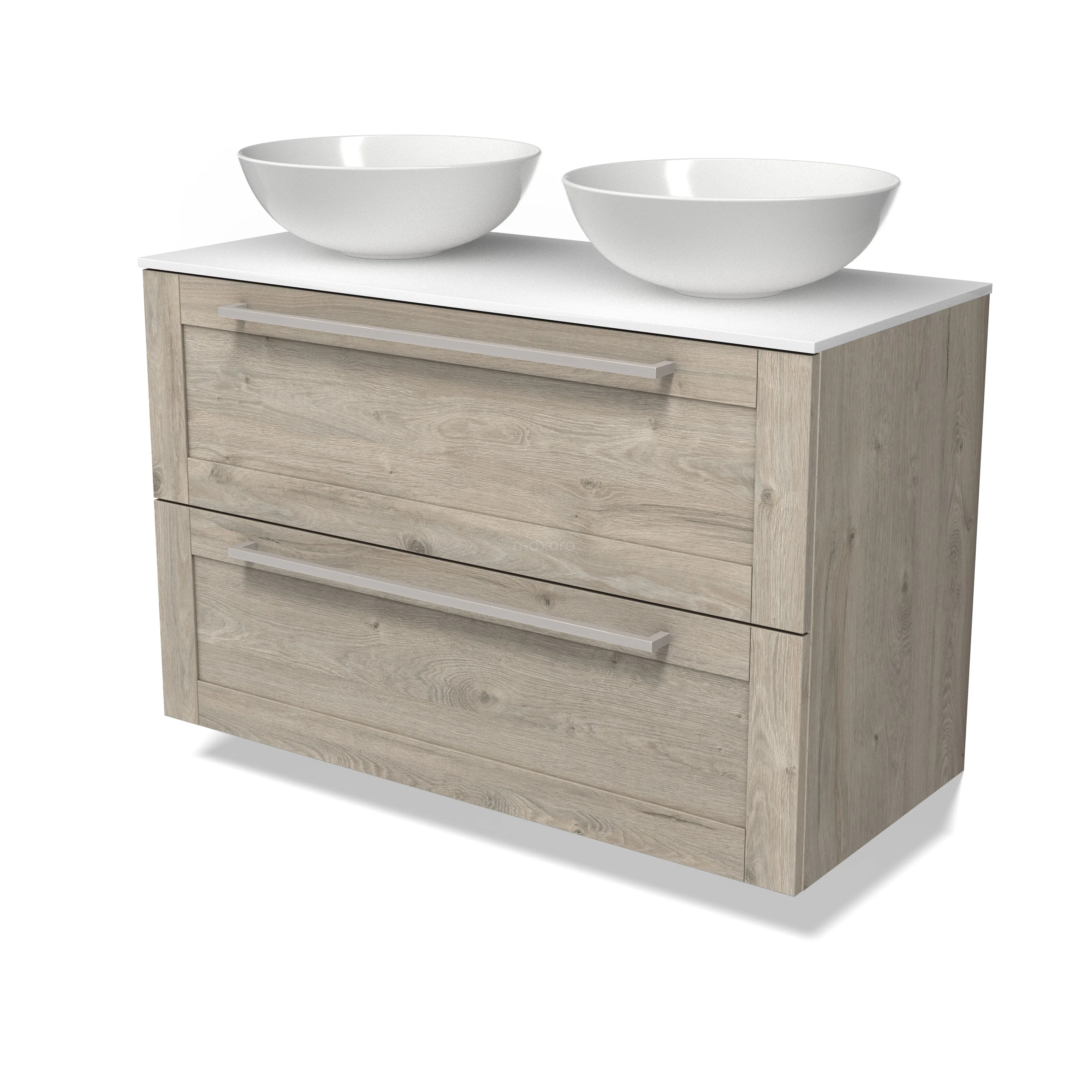Modulo Plato Badmöbel mit Aufsatzwaschbecken | 100 cm Hellgraue Eiche Rahmen front Solid Surface blatt 2 übereinanderliegende Schubladen