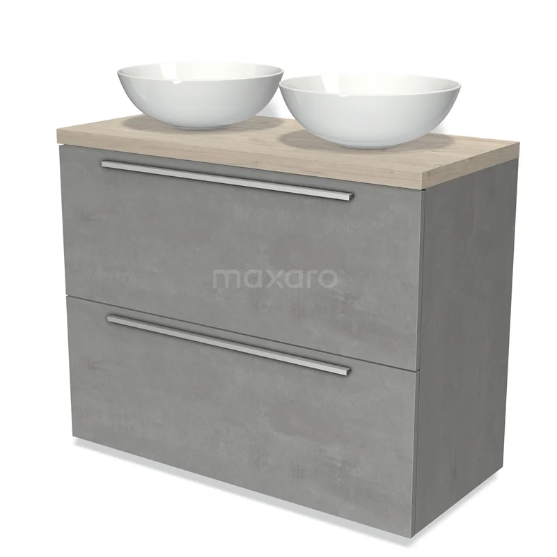Modulo Plato Badmöbel mit Aufsatzwaschbecken | 100 cm Hellgrauer Beton Flach front Hellgraue Eiche blatt 2 hohe Schubladen übereinanderliegend