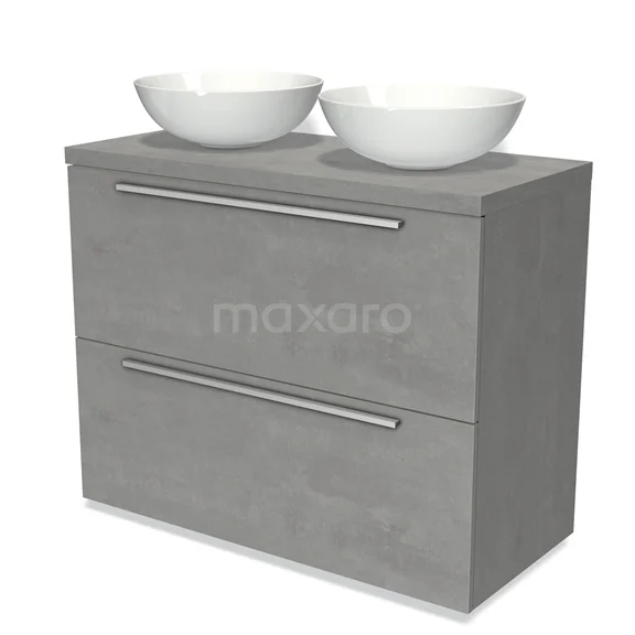 Modulo Plato Badmöbel mit Aufsatzwaschbecken | 100 cm Hellgrauer Beton Flach front Hellgrauer Beton blatt 2 hohe Schubladen übereinanderliegend