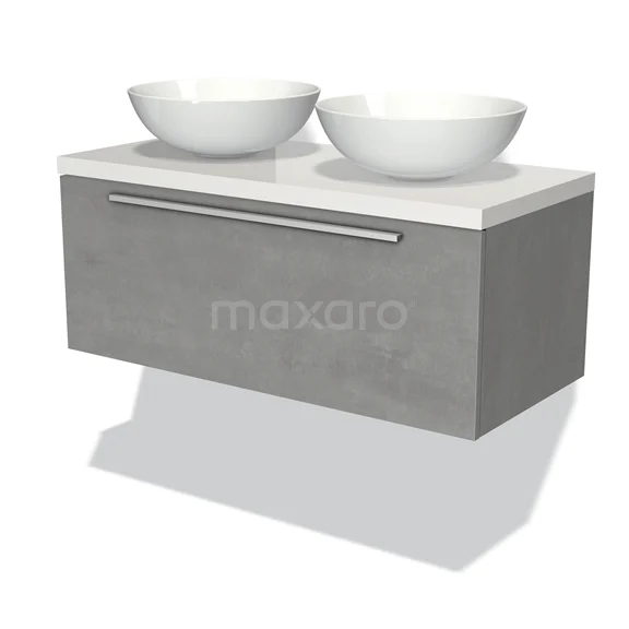 Modulo Plato Badmöbel mit Aufsatzwaschbecken | 100 cm Hellgrauer Beton Flach front Hochglanz Weiß blatt 1 Schublade