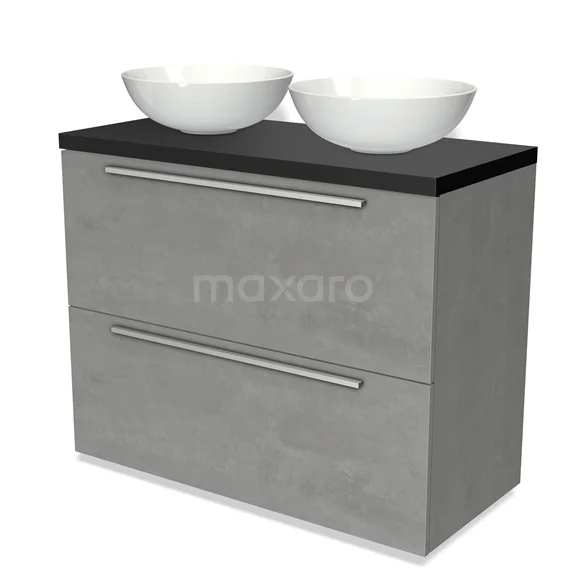 Modulo Plato Badmöbel mit Aufsatzwaschbecken | 100 cm Hellgrauer Beton Flach front Matt Schwarz blatt 2 hohe Schubladen übereinanderliegend