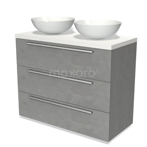 Modulo Plato Badmöbel mit Aufsatzwaschbecken | 100 cm Hellgrauer Beton Flach front Matt Weiß blatt 3 Schubladen