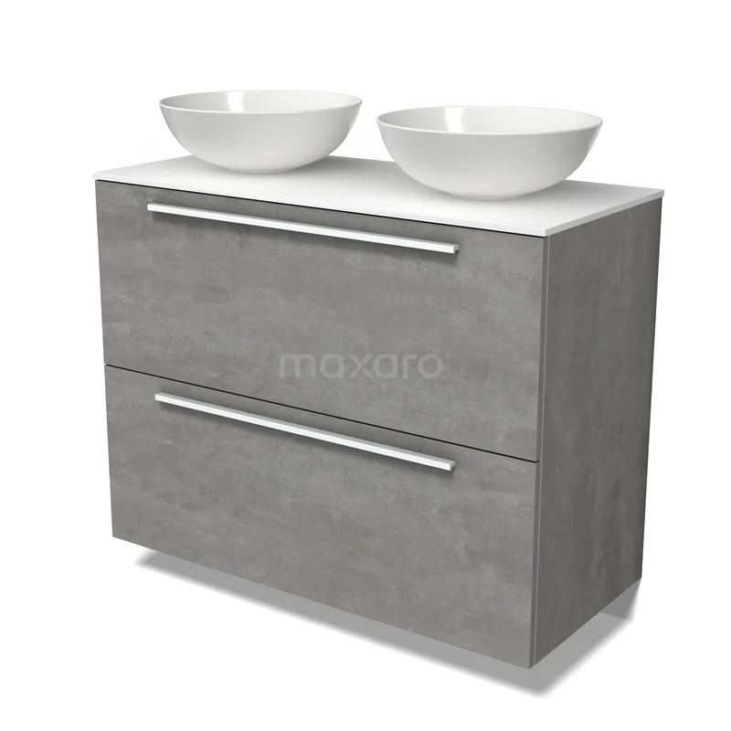 Modulo Plato Badmöbel mit Aufsatzwaschbecken | 100 cm Hellgrauer Beton Flach front Solid Surface blatt 2 hohe Schubladen übereinanderliegend