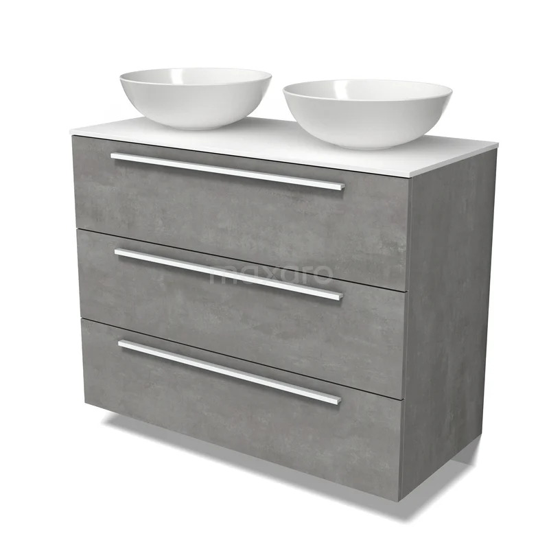 Modulo Plato Badmöbel mit Aufsatzwaschbecken | 100 cm Hellgrauer Beton Flach front Solid Surface blatt 3 Schubladen