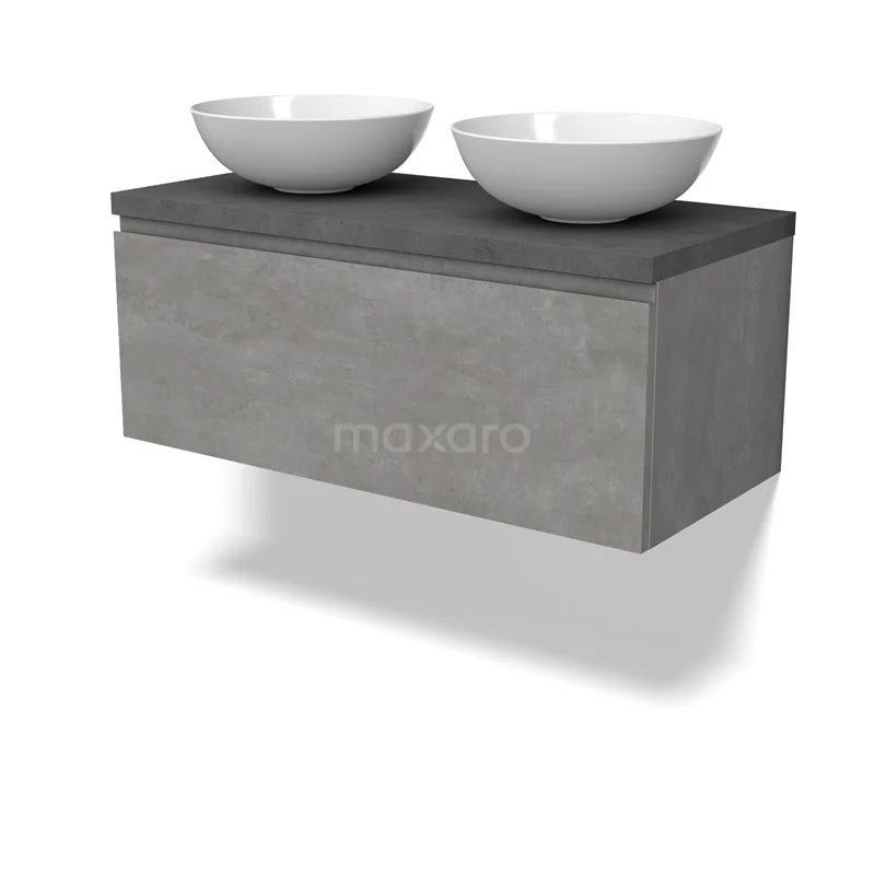 Modulo Plato Badmöbel mit Aufsatzwaschbecken | 100 cm Hellgrauer Beton Grifflos front Dunkelgrauer Beton blatt 1 Schublade