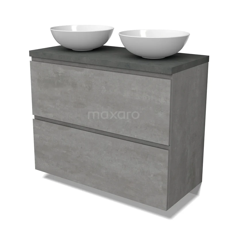 Modulo Plato Badmöbel mit Aufsatzwaschbecken | 100 cm Hellgrauer Beton Grifflos front Dunkelgrauer Beton blatt 2 hohe Schubladen übereinanderliegend