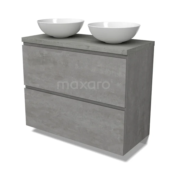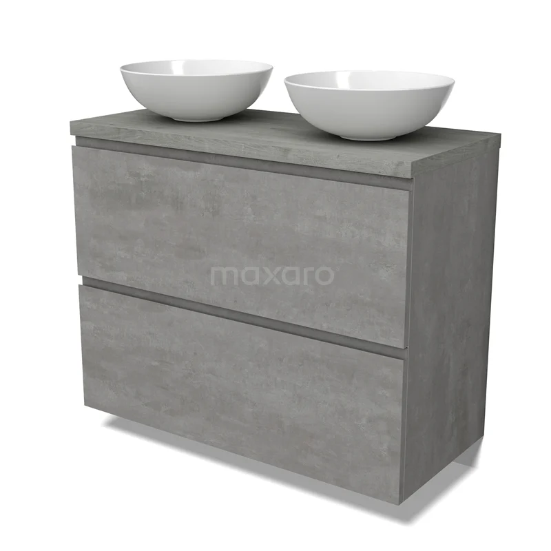 Modulo Plato Badmöbel mit Aufsatzwaschbecken | 100 cm Hellgrauer Beton Grifflos front Graue Eiche blatt 2 hohe Schubladen übereinanderliegend
