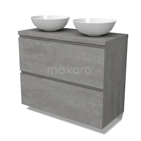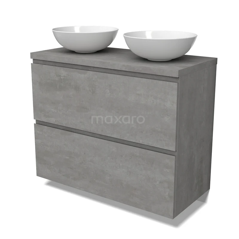 Modulo Plato Badmöbel mit Aufsatzwaschbecken | 100 cm Hellgrauer Beton Grifflos front Hellgrauer Beton blatt 2 hohe Schubladen übereinanderliegend