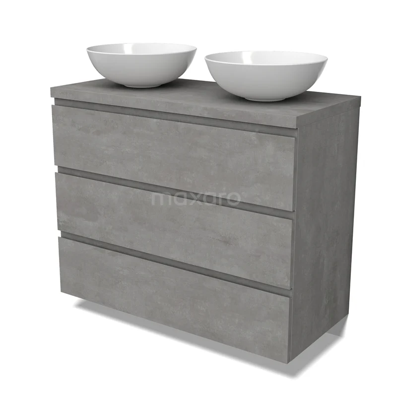 Modulo Plato Badmöbel mit Aufsatzwaschbecken | 100 cm Hellgrauer Beton Grifflos front Hellgrauer Beton blatt 3 Schubladen