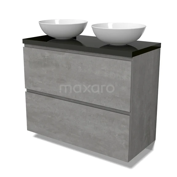 Modulo Plato Badmöbel mit Aufsatzwaschbecken | 100 cm Hellgrauer Beton Grifflos front Hochglanz Schwarz blatt 2 hohe Schubladen übereinanderliegend
