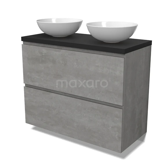 Modulo Plato Badmöbel mit Aufsatzwaschbecken | 100 cm Hellgrauer Beton Grifflos front Matt Schwarz blatt 2 hohe Schubladen übereinanderliegend