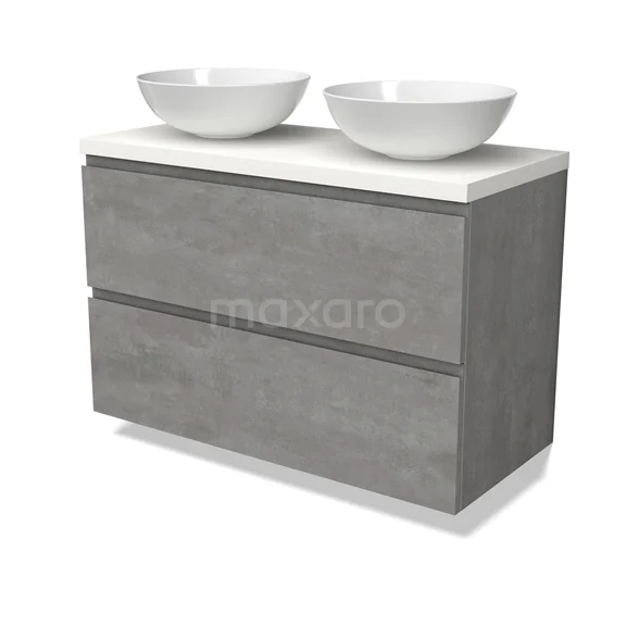 Modulo Plato Badmöbel mit Aufsatzwaschbecken | 100 cm Hellgrauer Beton Grifflos front Matt Weiß blatt 2 übereinanderliegende Schubladen BMK17-02871