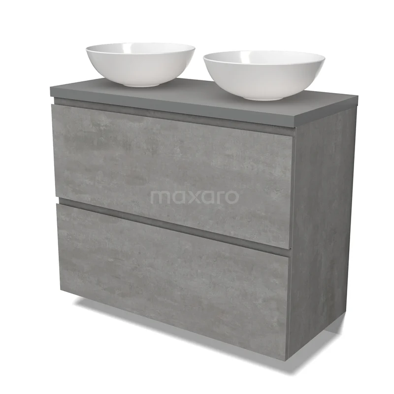 Modulo Plato Badmöbel mit Aufsatzwaschbecken | 100 cm Hellgrauer Beton Grifflos front Mittelgrau blatt 2 hohe Schubladen übereinanderliegend