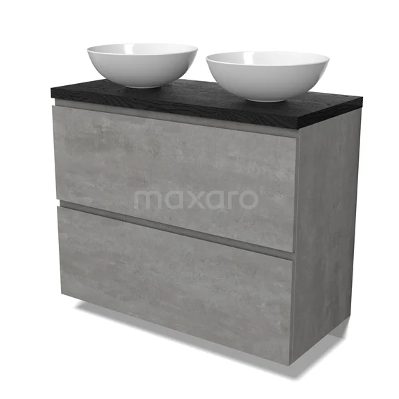 Modulo Plato Badmöbel mit Aufsatzwaschbecken | 100 cm Hellgrauer Beton Grifflos front Schwarze Eiche blatt 2 hohe Schubladen übereinanderliegend