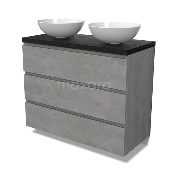Modulo Plato Badmöbel mit Aufsatzwaschbecken | 100 cm Hellgrauer Beton Grifflos front Schwarze Eiche blatt 3 Schubladen