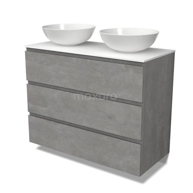 Modulo Plato Badmöbel mit Aufsatzwaschbecken | 100 cm Hellgrauer Beton Grifflos front Solid Surface blatt 3 Schubladen