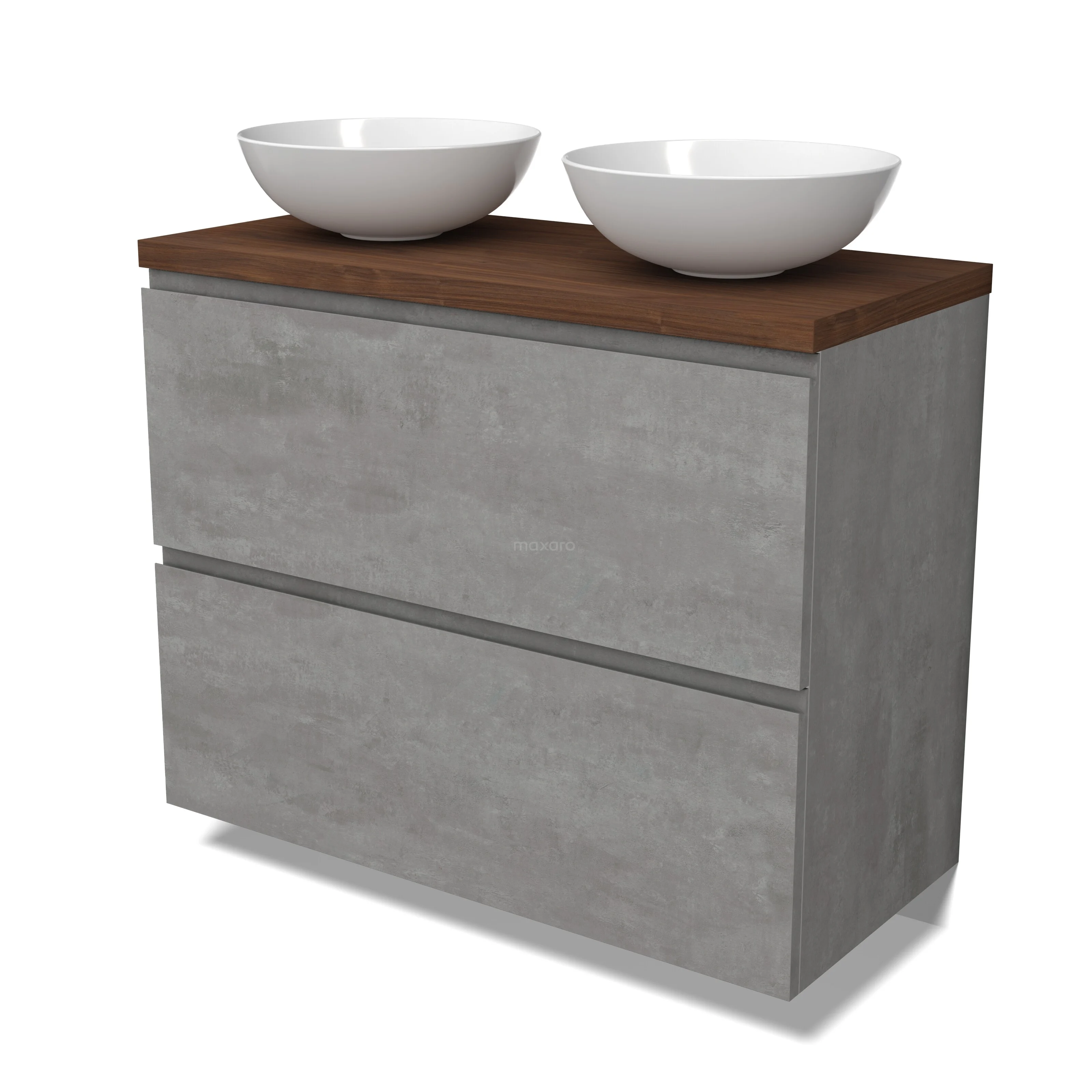 Modulo Plato Badmöbel mit Aufsatzwaschbecken | 100 cm Hellgrauer Beton Grifflos front Walnuss blatt 2 hohe Schubladen übereinanderliegend
