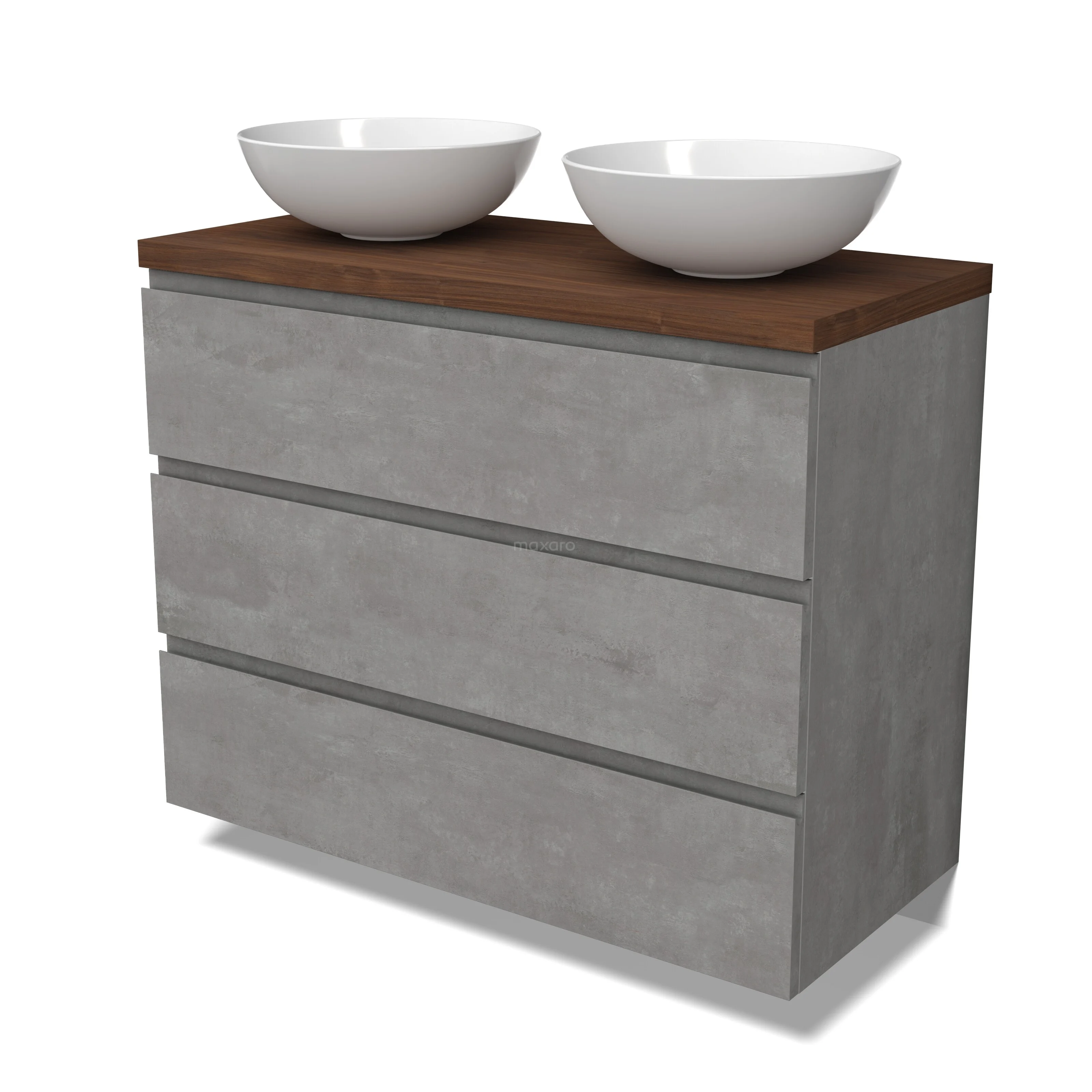 Modulo Plato Badmöbel mit Aufsatzwaschbecken | 100 cm Hellgrauer Beton Grifflos front Walnuss blatt 3 Schubladen