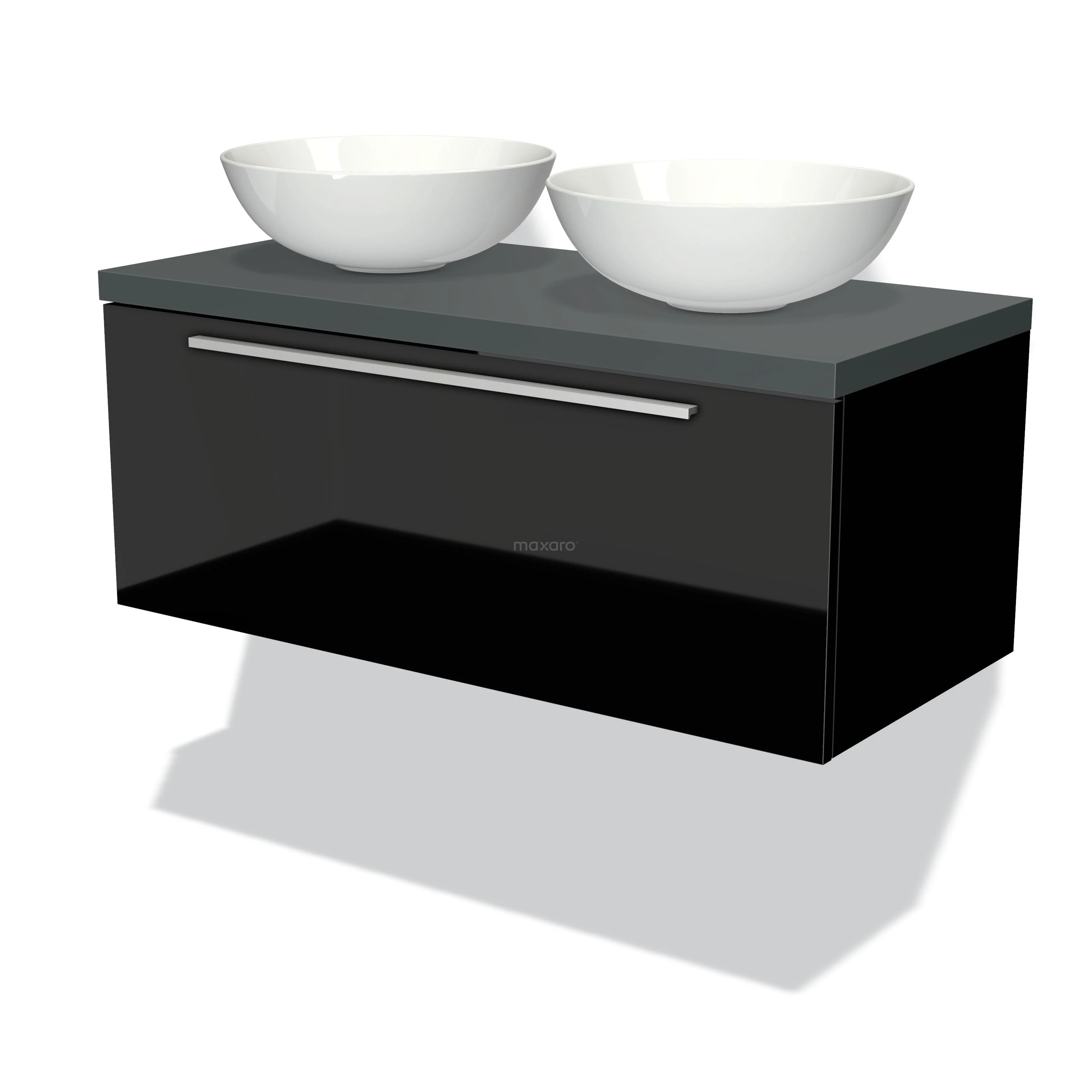 Modulo Plato Badmöbel mit Aufsatzwaschbecken | 100 cm Hochglanz Schwarz Flach front Dunkelgrau blatt 1 Schublade