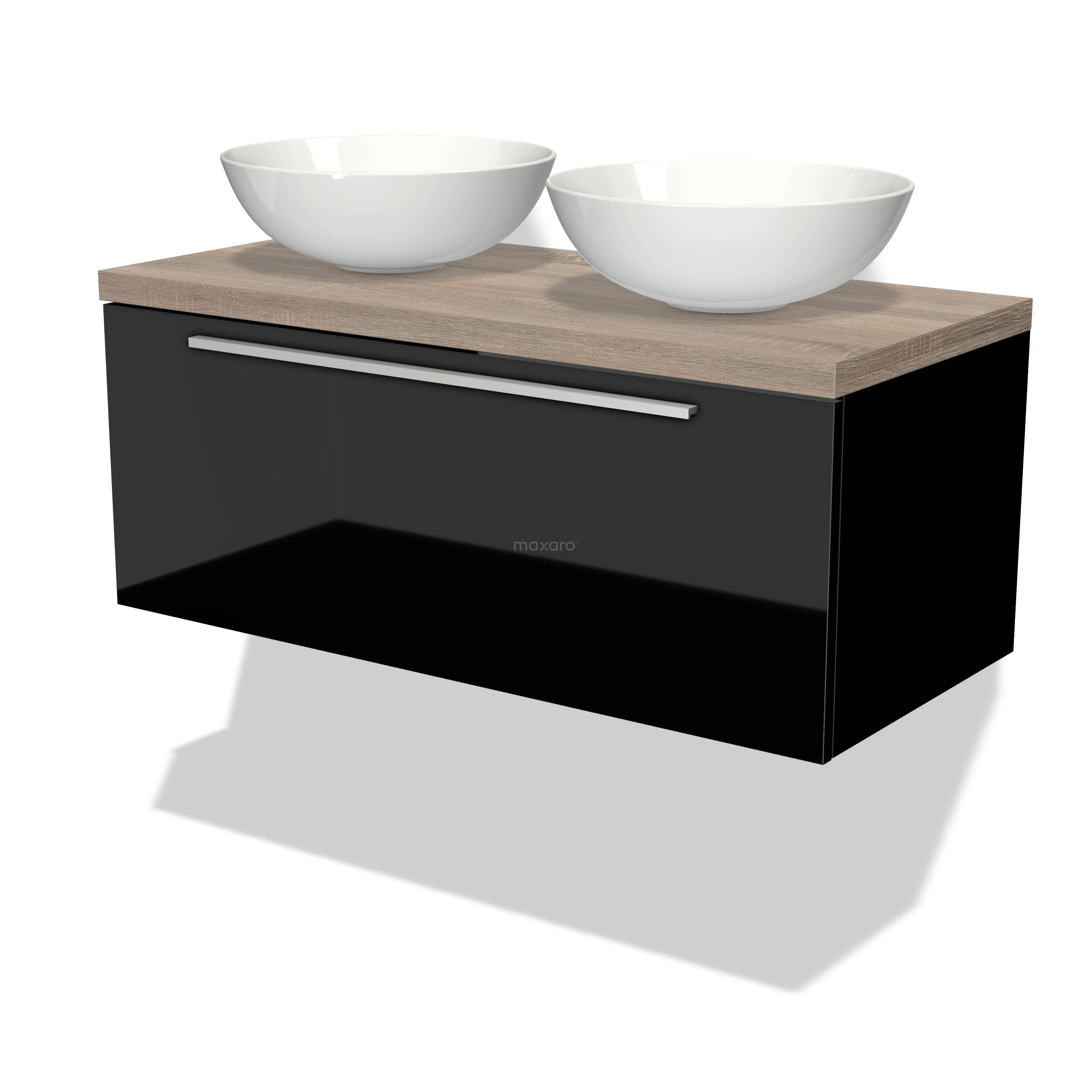 Modulo Plato Badmöbel mit Aufsatzwaschbecken | 100 cm Hochglanz Schwarz Flach front Eiche blatt 1 Schublade