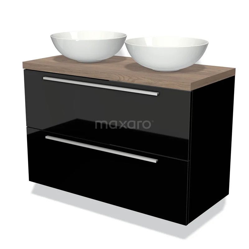 Modulo Plato Badmöbel mit Aufsatzwaschbecken | 100 cm Hochglanz Schwarz Flach front Mittelbraune Eiche blatt 2 übereinanderliegende Schubladen