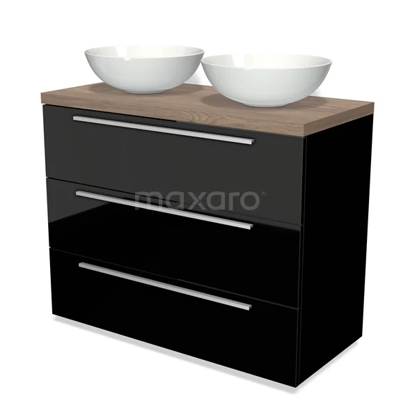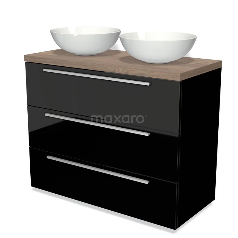 Modulo Plato Badmöbel mit Aufsatzwaschbecken | 100 cm Hochglanz Schwarz Flach front Mittelbraune Eiche blatt 3 Schubladen