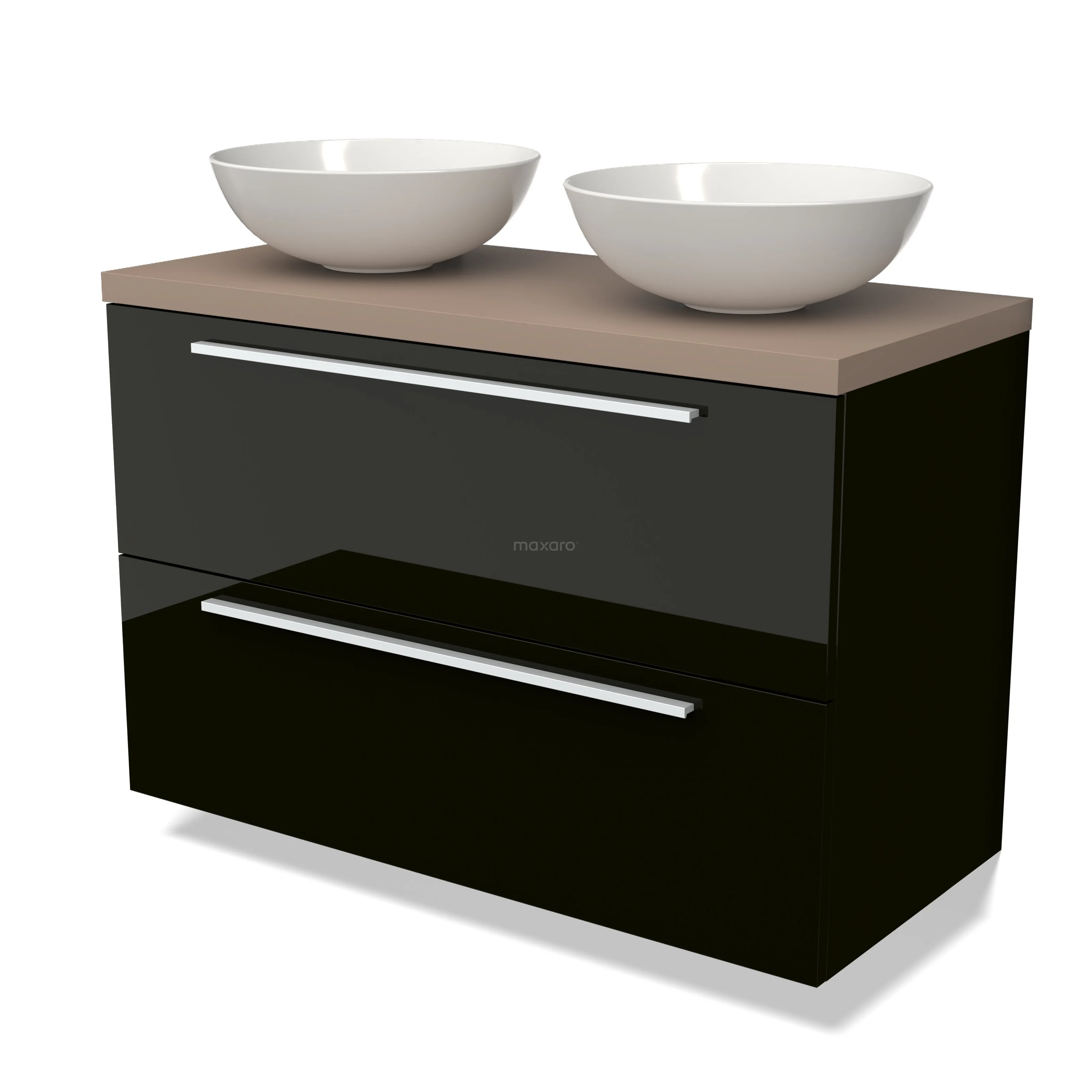 Modulo Plato Badmöbel mit Aufsatzwaschbecken | 100 cm Hochglanz Schwarz Flach front Taupe blatt 2 übereinanderliegende Schubladen