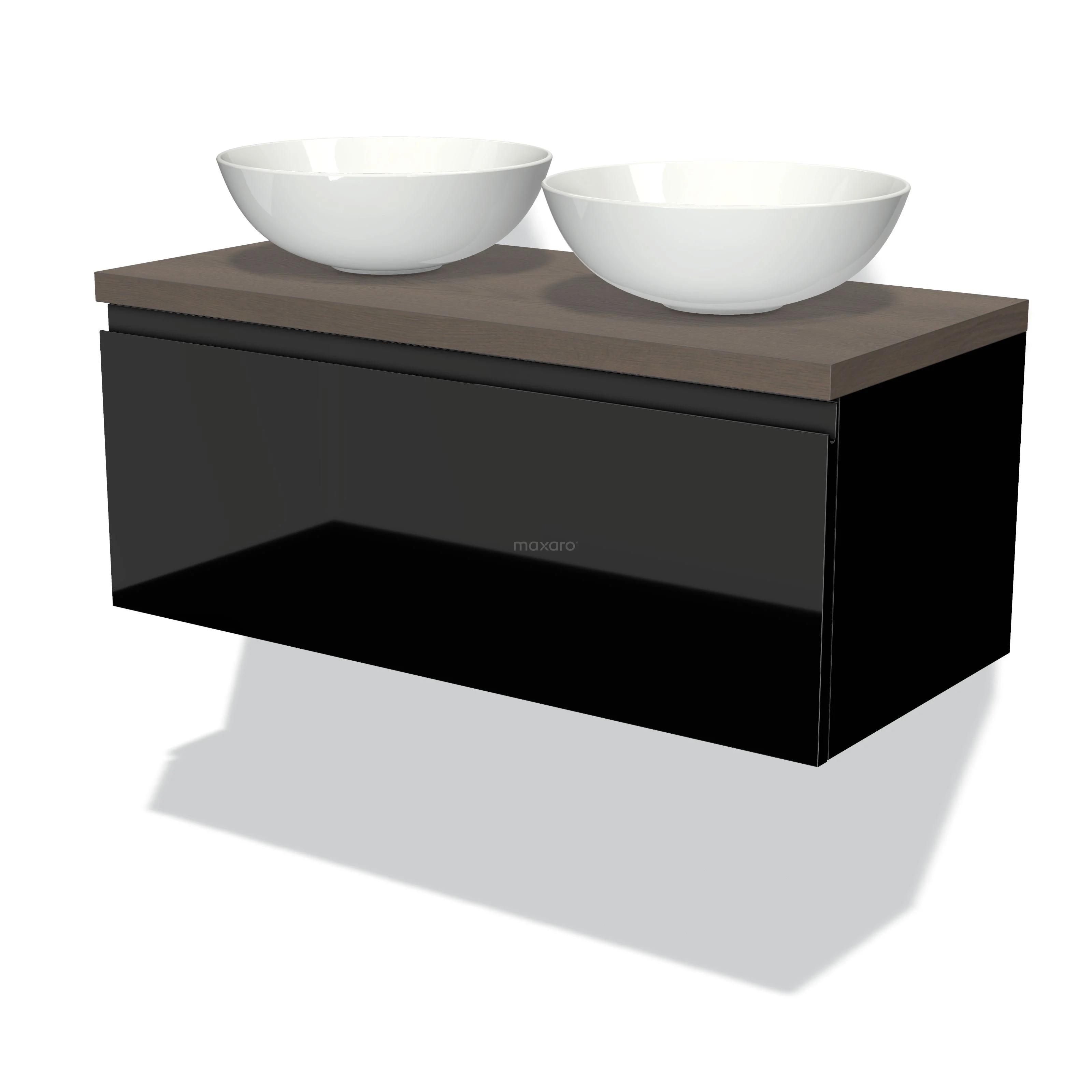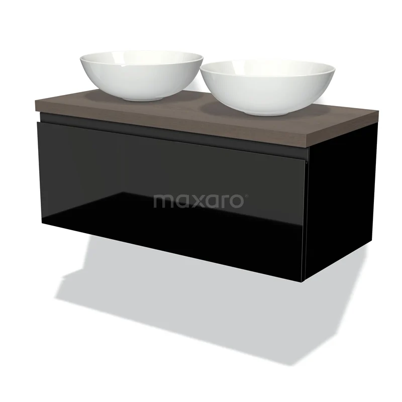 Modulo Plato Badmöbel mit Aufsatzwaschbecken | 100 cm Hochglanz Schwarz Grifflos front Dunkelbraune Eiche blatt 1 Schublade