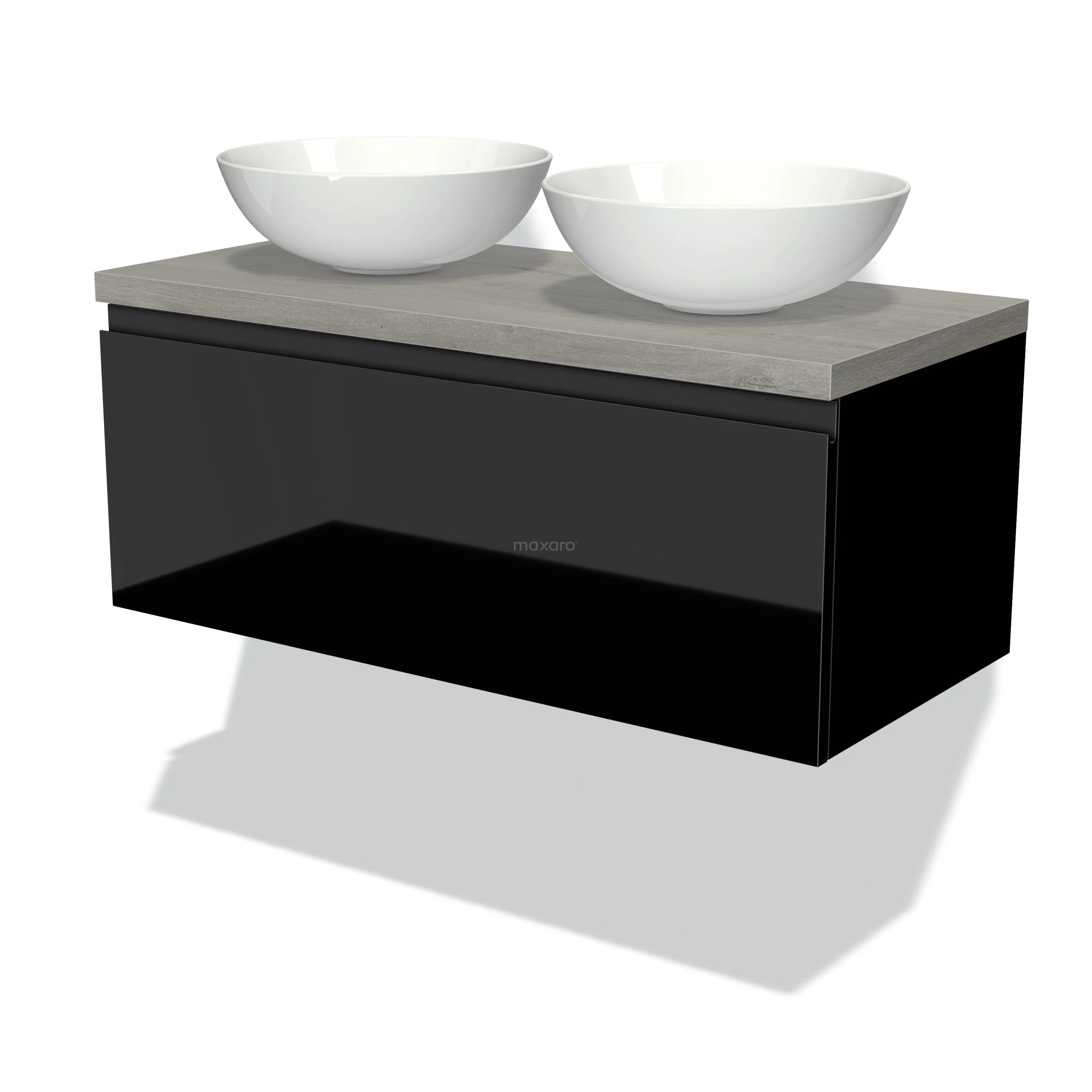 Modulo Plato Badmöbel mit Aufsatzwaschbecken | 100 cm Hochglanz Schwarz Grifflos front Graue Eiche blatt 1 Schublade