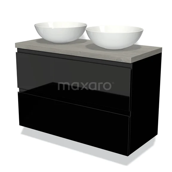 Modulo Plato Badmöbel mit Aufsatzwaschbecken | 100 cm Hochglanz Schwarz Grifflos front Graue Eiche blatt 2 übereinanderliegende Schubladen