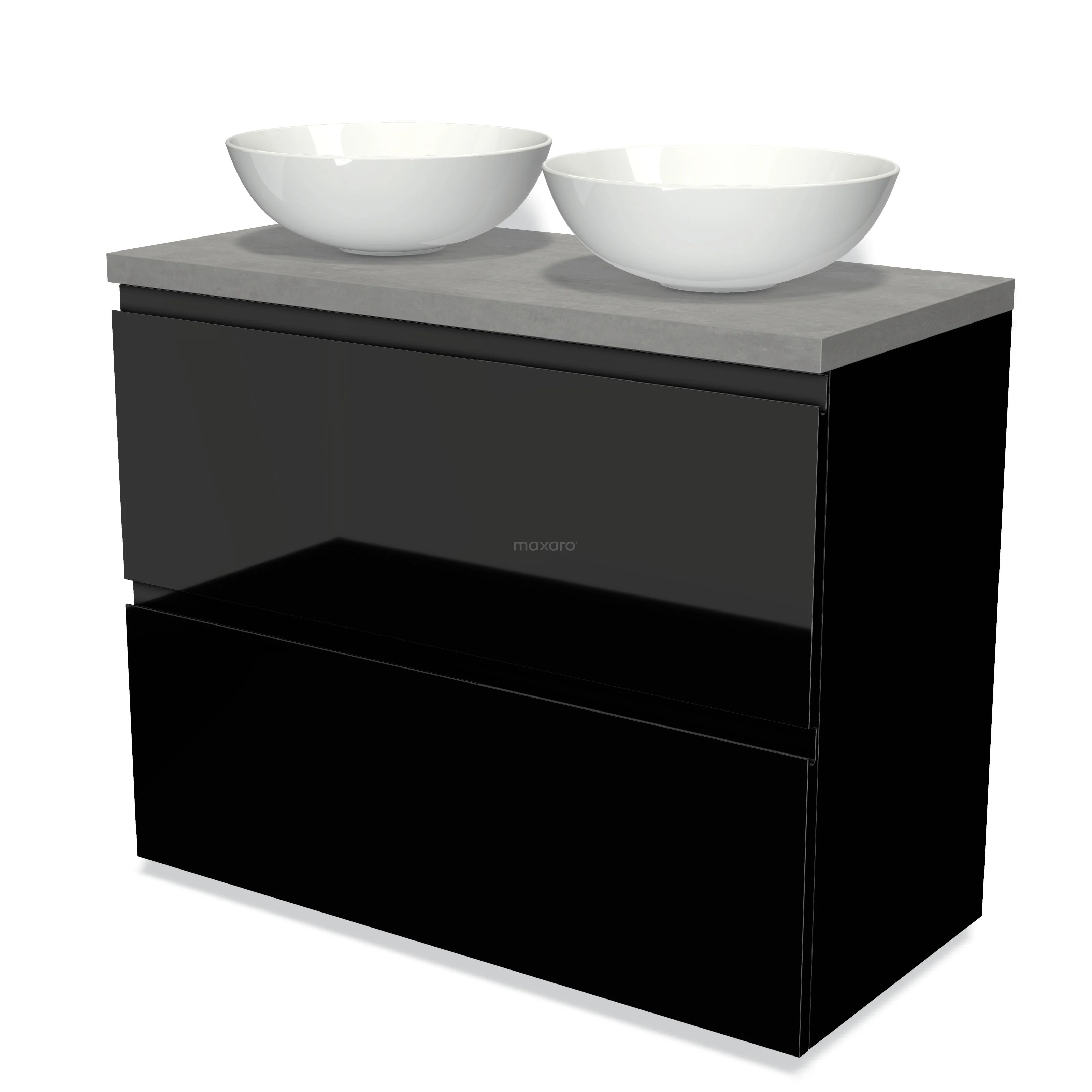 Modulo Plato Badmöbel mit Aufsatzwaschbecken | 100 cm Hochglanz Schwarz Grifflos front Hellgrauer Beton blatt 2 hohe Schubladen übereinanderliegend