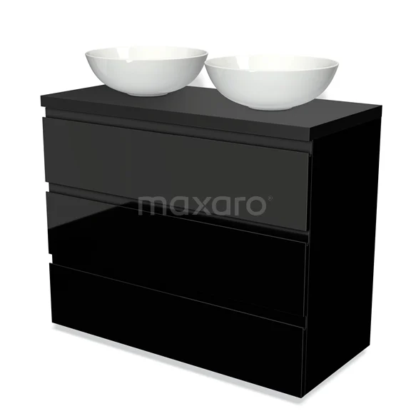 Modulo Plato Badmöbel mit Aufsatzwaschbecken | 100 cm Hochglanz Schwarz Grifflos front Matt Schwarz blatt 3 Schubladen