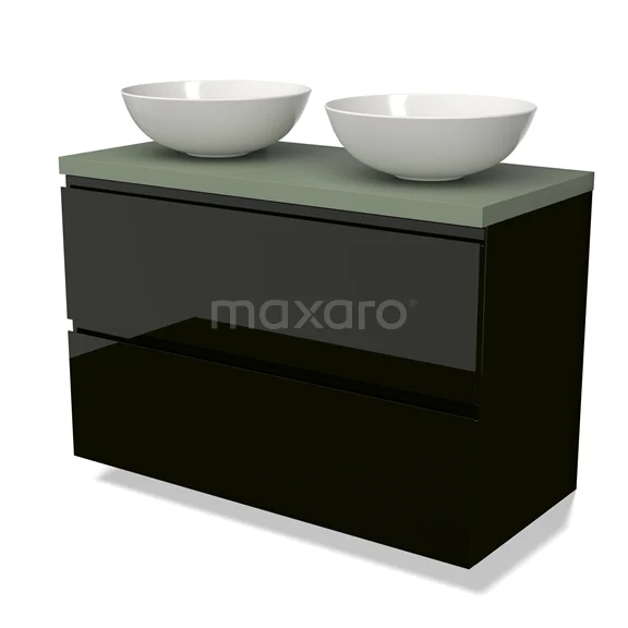 Modulo Plato Badmöbel mit Aufsatzwaschbecken | 100 cm Hochglanz Schwarz Grifflos front Salbeigrün blatt 2 übereinanderliegende Schubladen