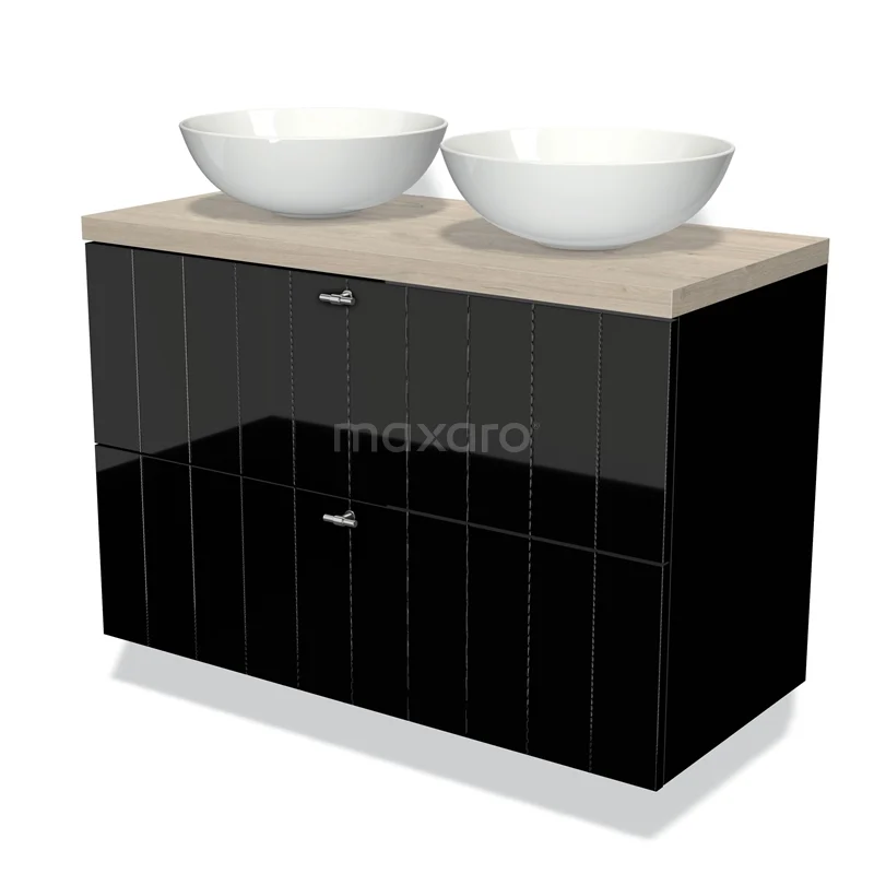Modulo Plato Badmöbel mit Aufsatzwaschbecken | 100 cm Hochglanz Schwarz Lamelle front Hellgraue Eiche blatt 2 übereinanderliegende Schubladen