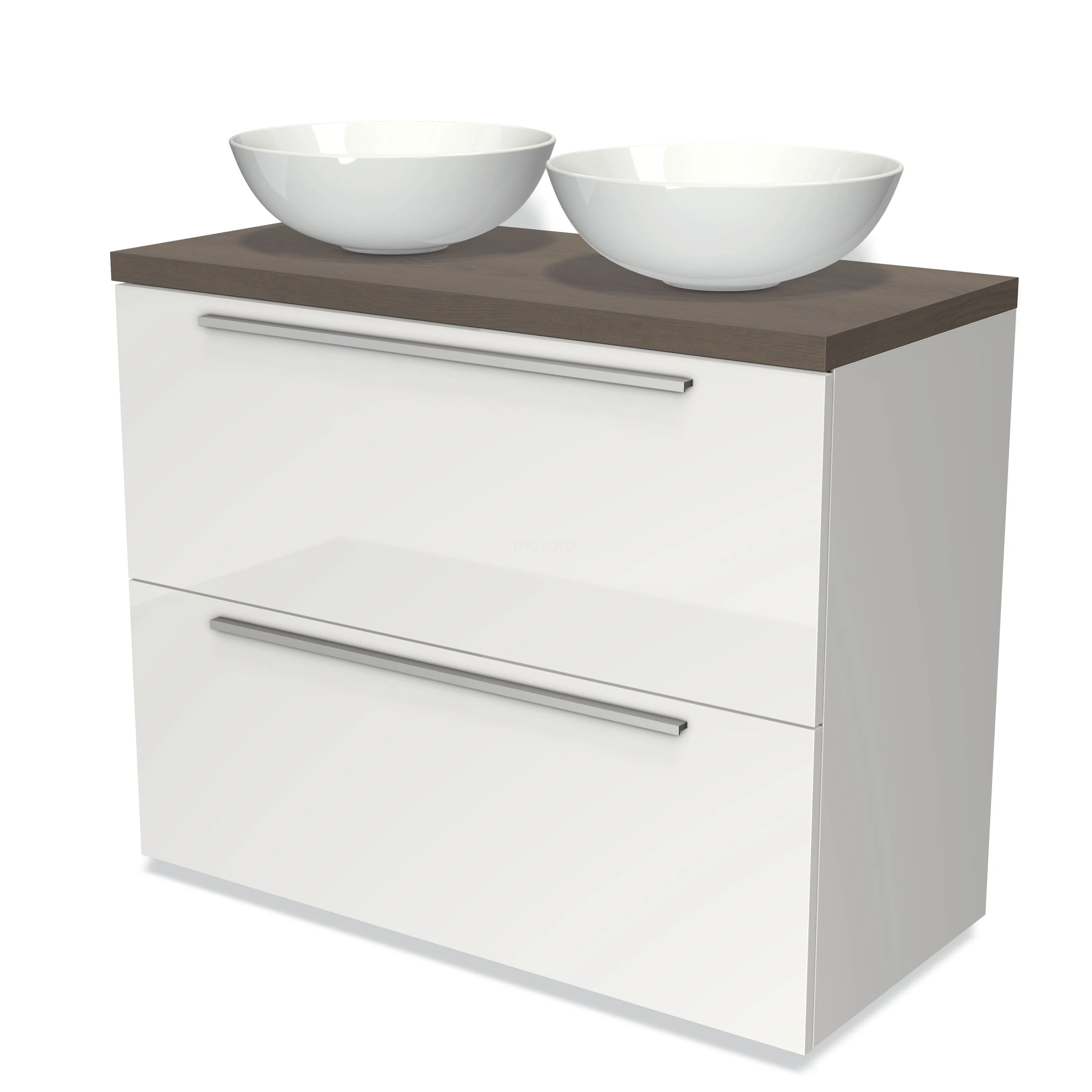 Modulo Plato Badmöbel mit Aufsatzwaschbecken | 100 cm Hochglanz Weiß Flach front Dunkelbraune Eiche blatt 2 hohe Schubladen übereinanderliegend