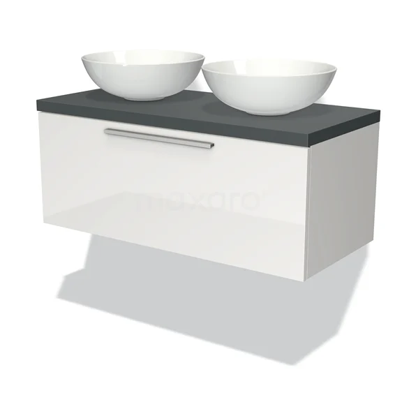 Modulo Plato Badmöbel mit Aufsatzwaschbecken | 100 cm Hochglanz Weiß Flach front Dunkelgrau blatt 1 Schublade