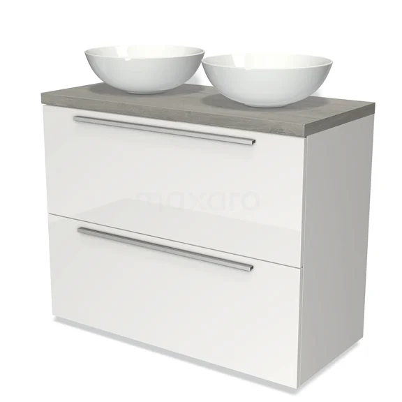 Modulo Plato Badmöbel mit Aufsatzwaschbecken | 100 cm Hochglanz Weiß Flach front Graue Eiche blatt 2 hohe Schubladen übereinanderliegend