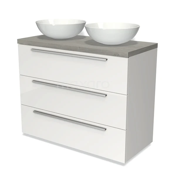 Modulo Plato Badmöbel mit Aufsatzwaschbecken | 100 cm Hochglanz Weiß Flach front Graue Eiche blatt 3 Schubladen