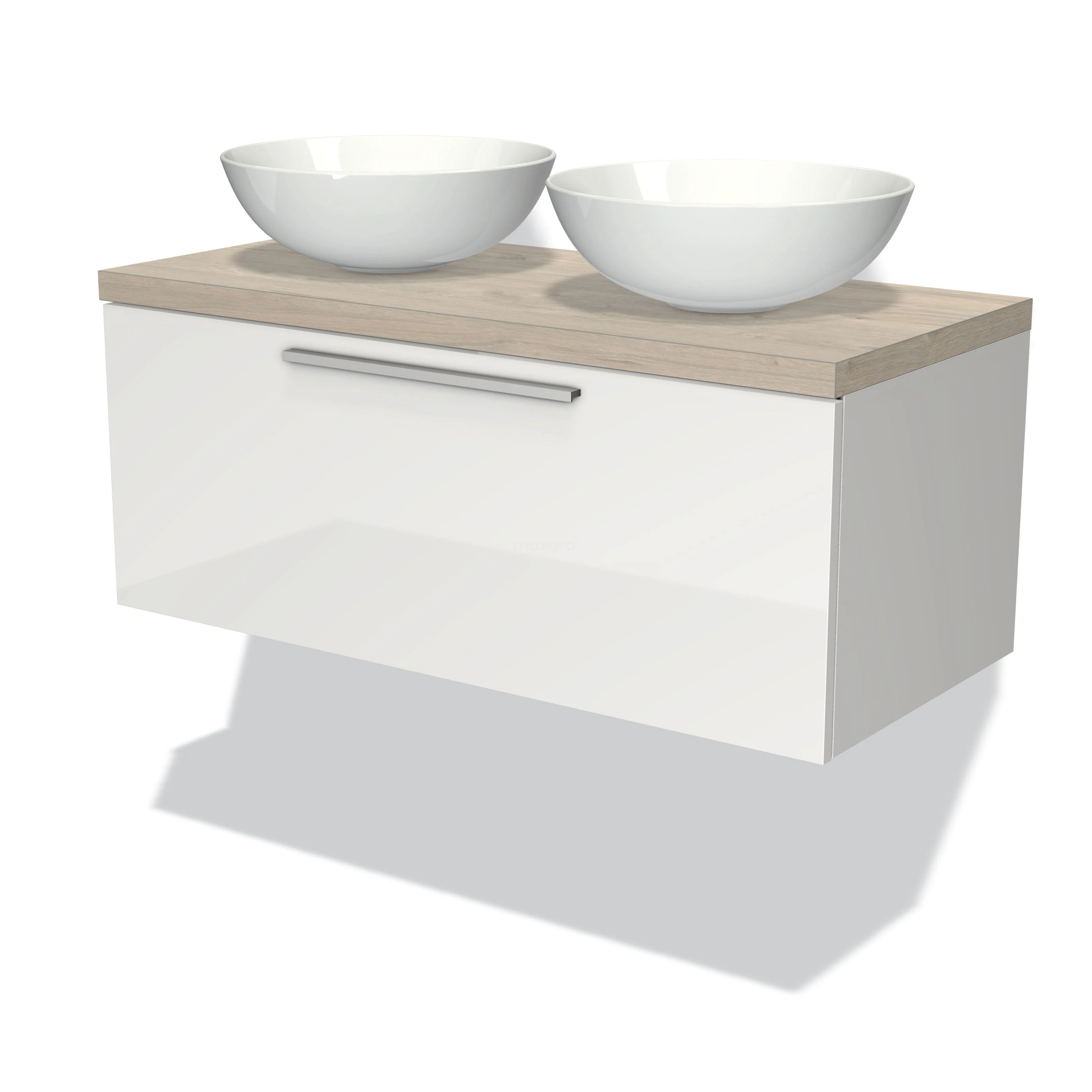 Modulo Plato Badmöbel mit Aufsatzwaschbecken | 100 cm Hochglanz Weiß Flach front Hellgraue Eiche blatt 1 Schublade