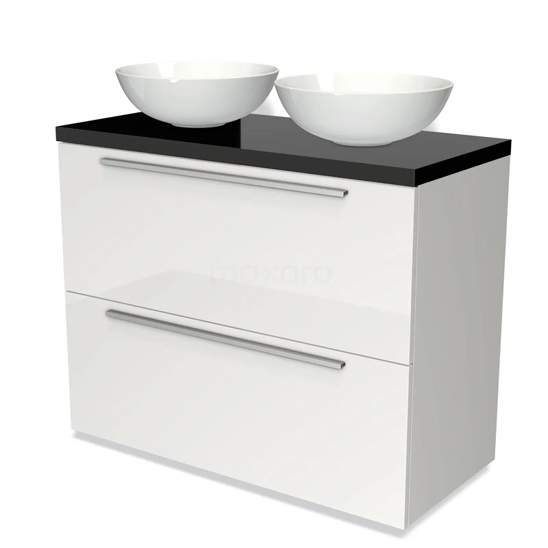 Modulo Plato Badmöbel mit Aufsatzwaschbecken | 100 cm Hochglanz Weiß Flach front Hochglanz Schwarz blatt 2 hohe Schubladen übereinanderliegend